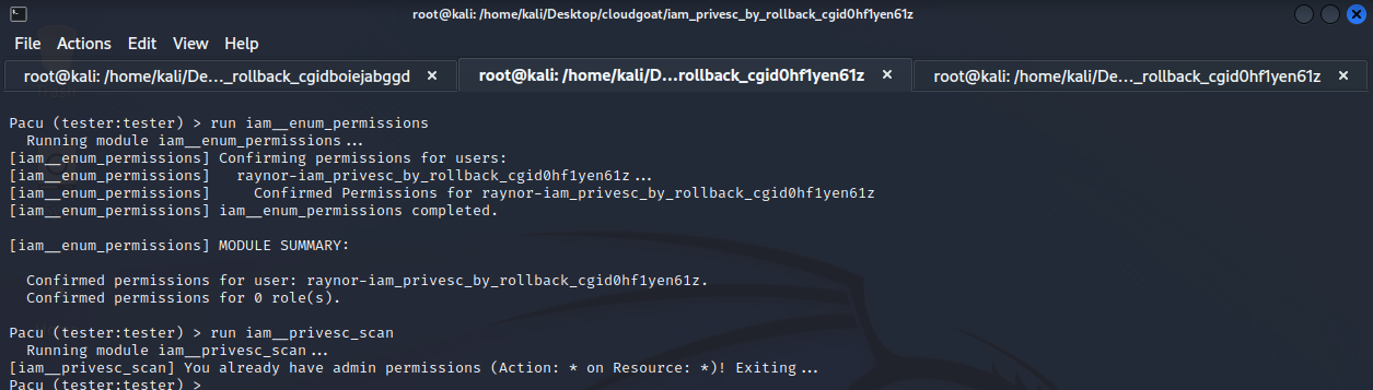 Step13.) “iam__enum_permissions”을 사용하여 tester에 대한 권한 목록을 수집 후 “iam__privesc_scan” 권한 상승 action을 탐색 했으나, 이미 관리자 권한을 가지고 있는 정책을 사용 중