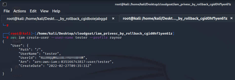 Step1.) cloudgoat 폴더에 접근 후 iam_privesc_by_rollback을 생성합니다. 생성 시 2번 째 그림과 같이 “Apply Complet” 메시지가 출력 됩니다.