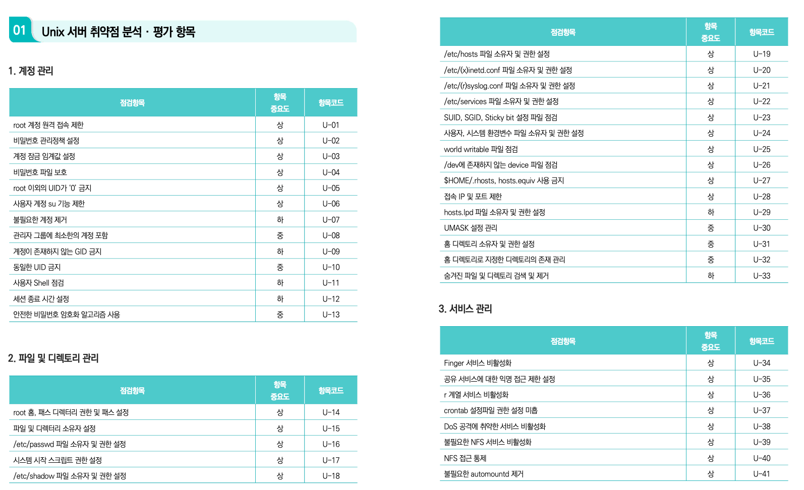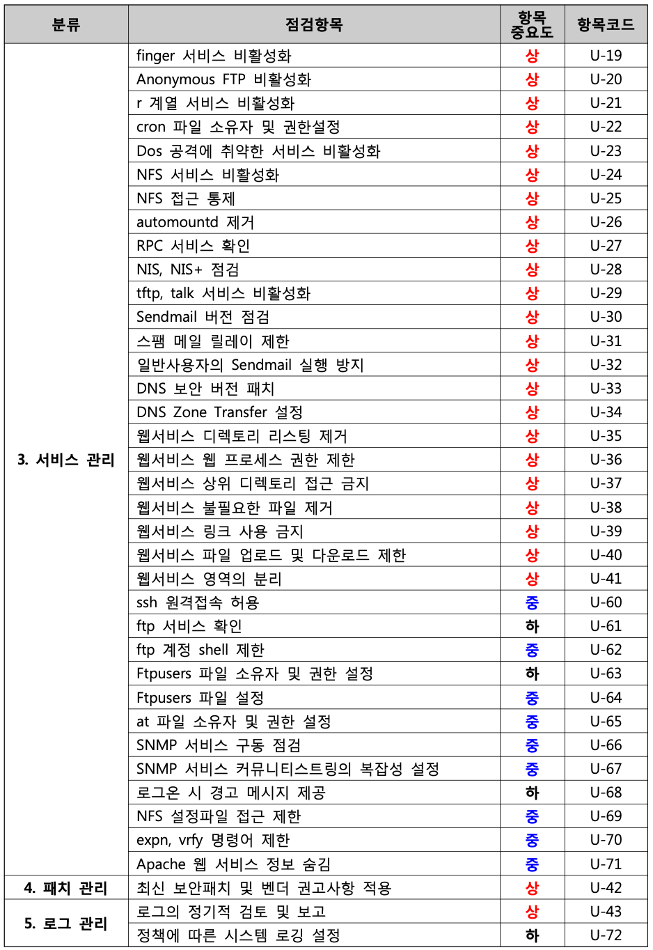 큰 변화는 '웹 서비스(Web Service)' 관련 항목들이 유닉스(Unix) 서버 점검 항목에서 대거 삭제되어 별도의 분야로 분리된 됐습니다.