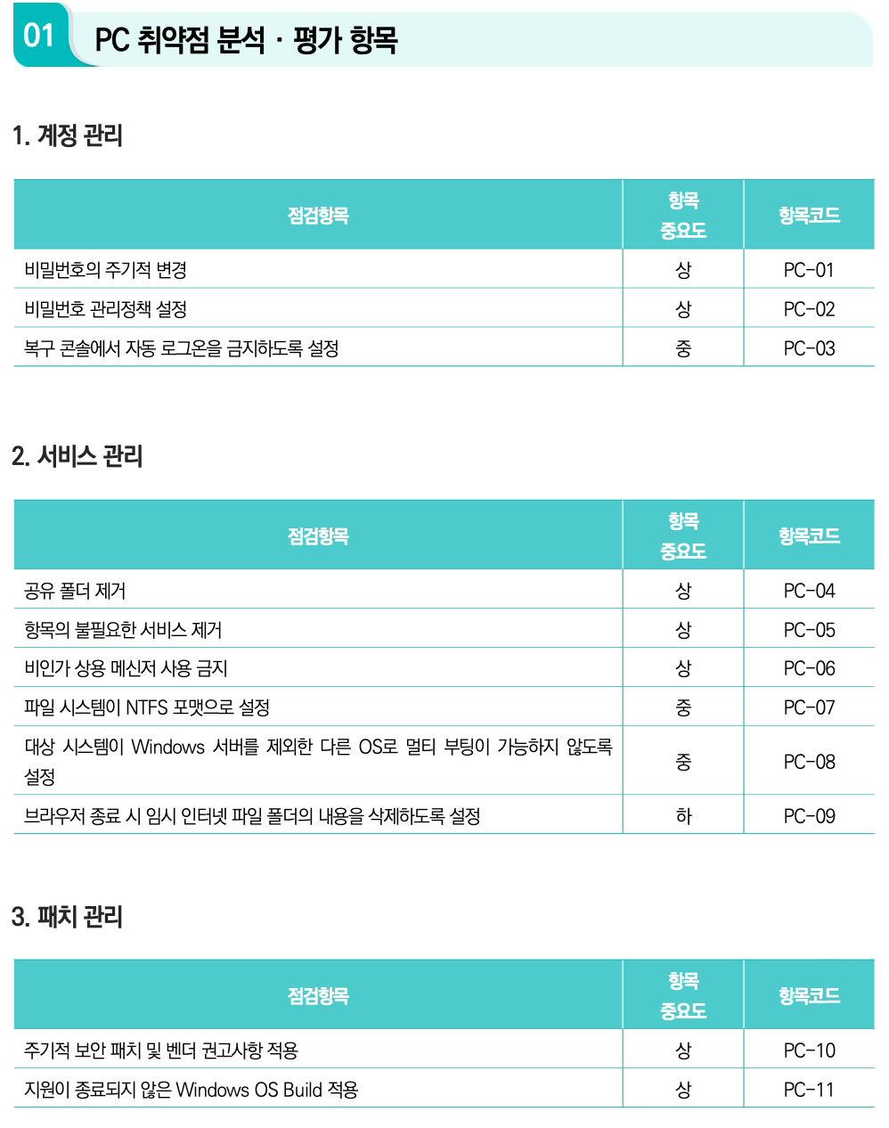 [삭제] PC-07 (OS 서비스팩 적용): Windows 10/11은 '서비스팩' 개념 대신 '빌드(Build)' 업데이트를 사용하므로, 해당 항목은 삭제되고 PC-11 (Windows OS Build) 항목으로 대체·강화되었습니다.