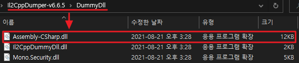 심볼릭 복구 시 아래 그림과 같이 "/Il2CppDumper-v6.6.5/DummyDll" 폴더에 "Assembly-CSharp.dll"파일이 생성됩니다.