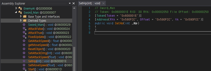 "Assembly-CSharp.dll"을 디컴파일 시 "SetHp" 함수가 확인 됐으며 해당 함수 "Offset 0x590FCC"의 값을 1만으로 리플레이스 되도록 후킹합니다.